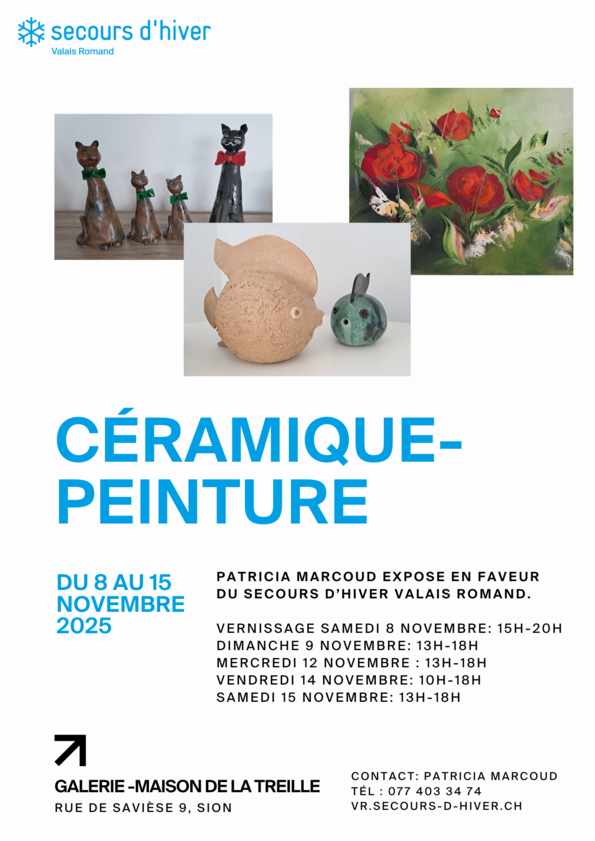 Vom 8. bis 15. November 2025 findet in der Galerie «Maison de la Treille» in Sion eine Ausstellung mit Keramiken und Gemälden von Patricia Marcoud statt.