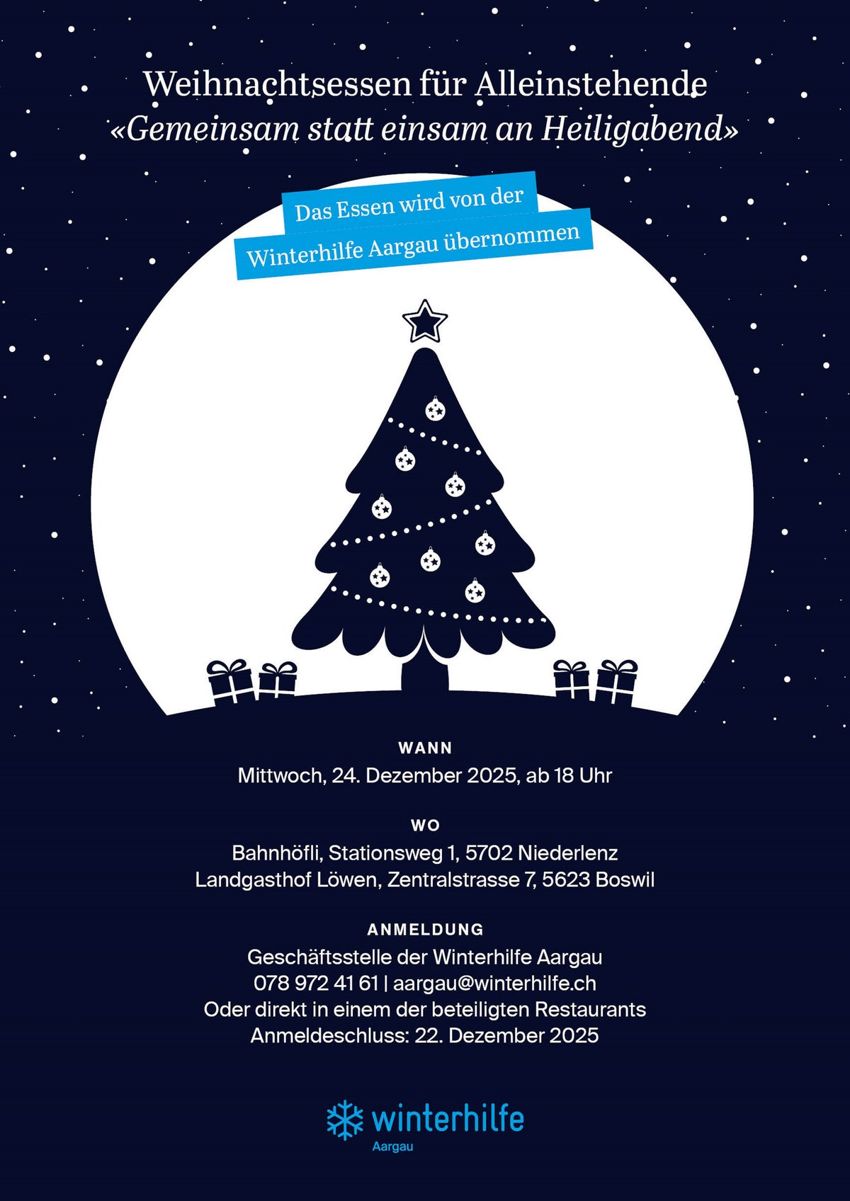 Auch dieses Jahr lädt die Winterhilfe Aargau am 24. Dezember 2025 herzlich zum Weihnachtsessen für Alleinstehende ein.